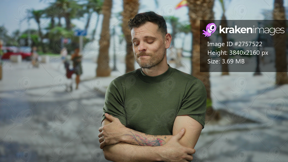 Man standing outdoors on an urban street with palm trees, wearing a green shirt, sporting a tattoo on his arm, appearing thoughtful while embracing himself. - Kraken Images