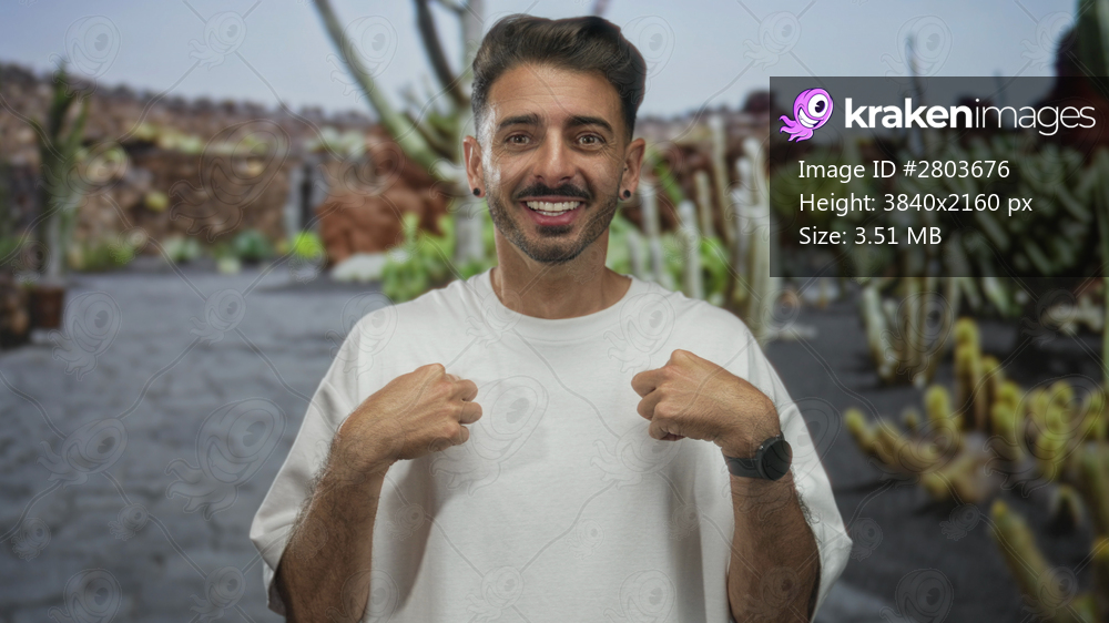 Man standing pointing finger to white shirt front in green park with cactus garden path; confidence.