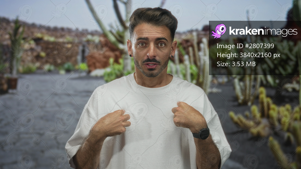 Man standing pointing finger to white shirt front in green park with cactus garden path; confidence.