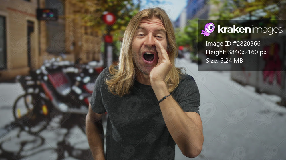 Man standing shouting through cupped hands revealing open mouth on street; announcement communication.