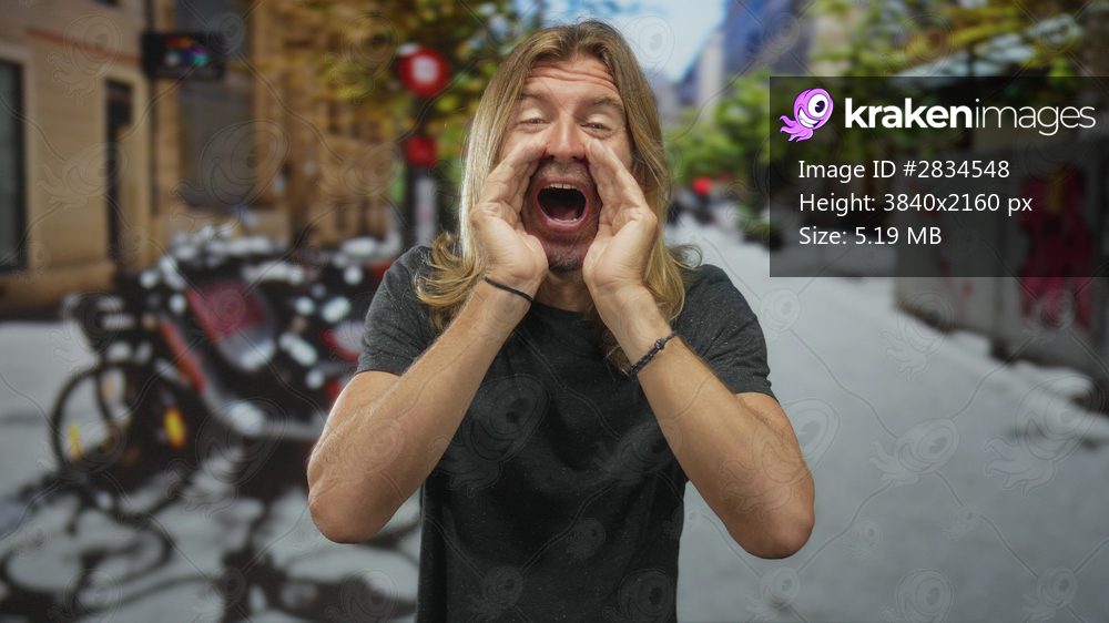 Man standing shouting through cupped hands revealing open mouth on street; announcement communication.