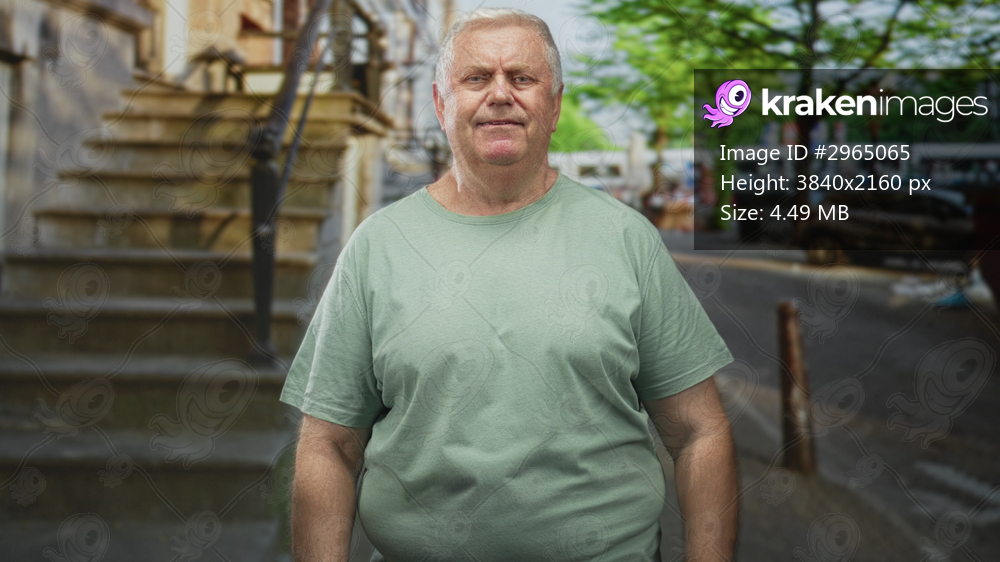 Man standing wearing a green t shirt with forearms visible, facing camera on a city street by stone steps and parked cars; calm dignity.