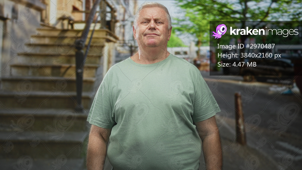 Man standing wearing a green t shirt with forearms visible, facing camera on a city street by stone steps and parked cars; calm dignity.