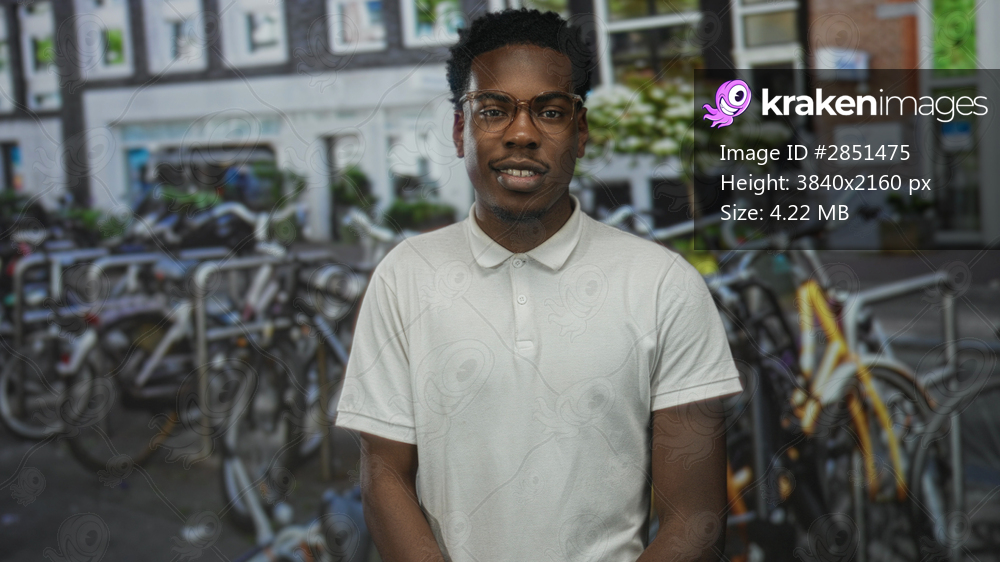 Man stands beside bike rack full of rental bicycles on busy street in city wearing white shirt and glasses, posing with relaxed posture; serenity.