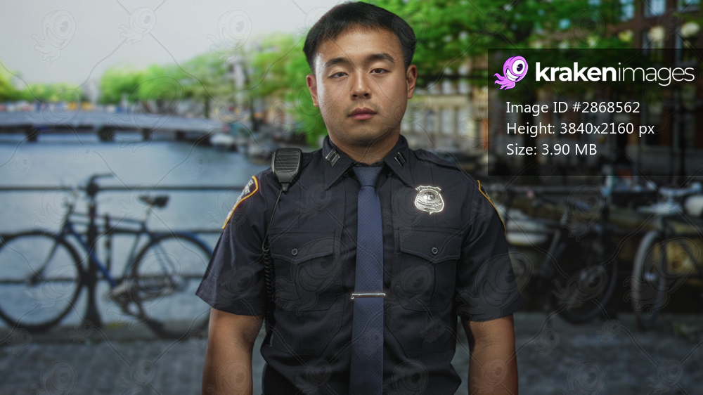 Man stands by canal with badge visible on uniform beside parked bicycles near water in street outdoors; duty.