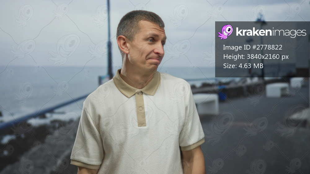 Man stands on a seaside promenade pointing sideways wearing casual polo with overcast sky in the background, giving a relaxed gesture near the beach.