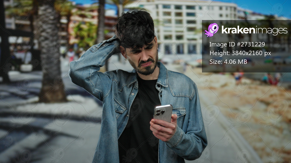 Man stands on promenade holding phone, appearing thoughtful, with seaside and palm trees in background on sunny day.