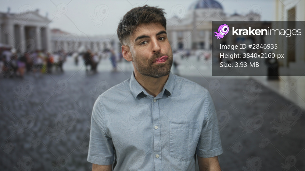Man stands with tongue out on street before vatican building; irreverent humor playful travel.