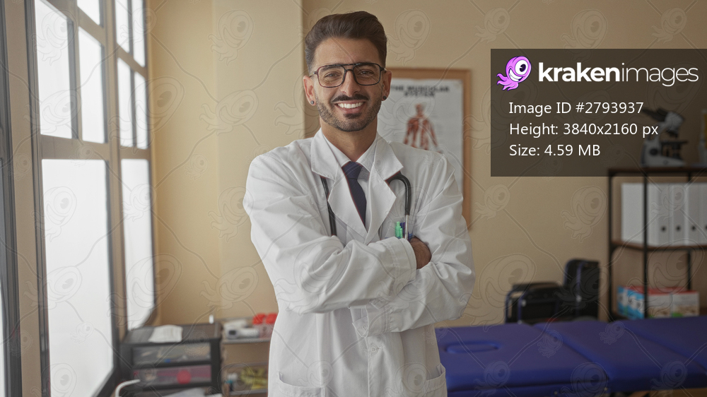 Man with stethoscope crossing arms in bright clinic wearing white coat and tie; professional confidence.