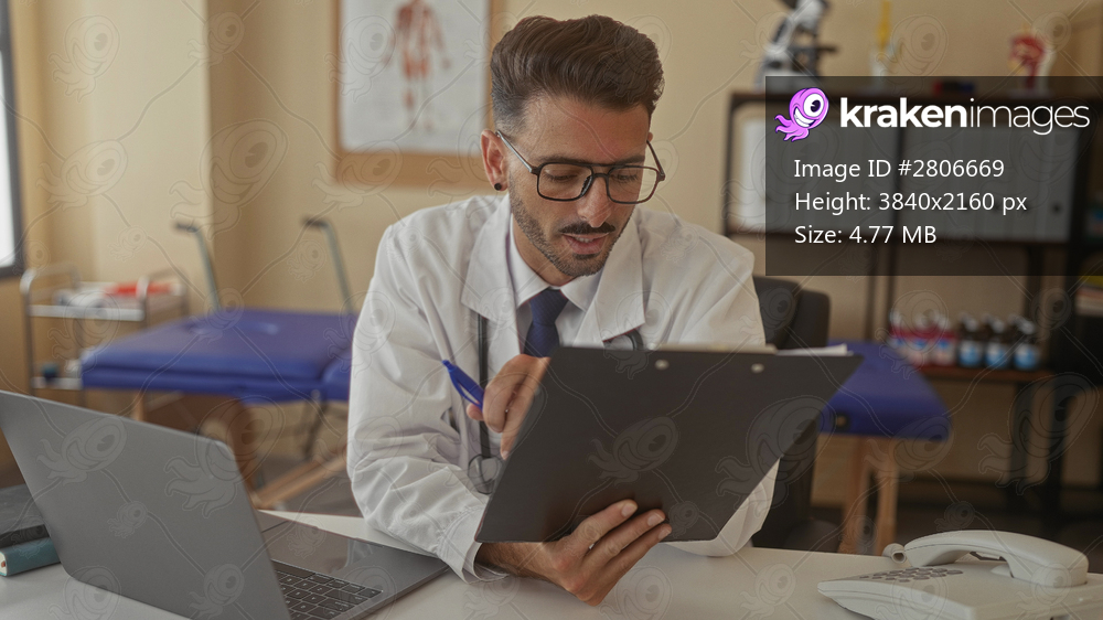 Man with stethoscope holds clipboard and types on laptop in clinic consulting room; concentration professionalism.