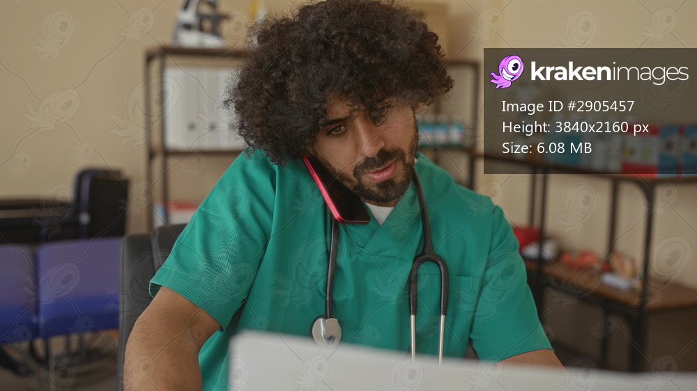 Man with stethoscope holds phone between shoulder and ear while reading medical papers at clinic building; concern duty compassion.