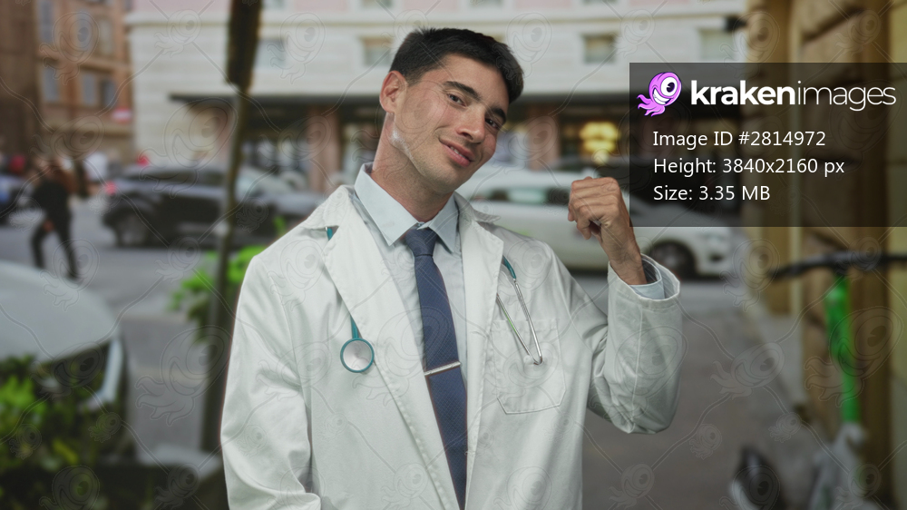 Man with stethoscope points his right thumb backward in an urban street scene among parked cars and passersby; confidence.