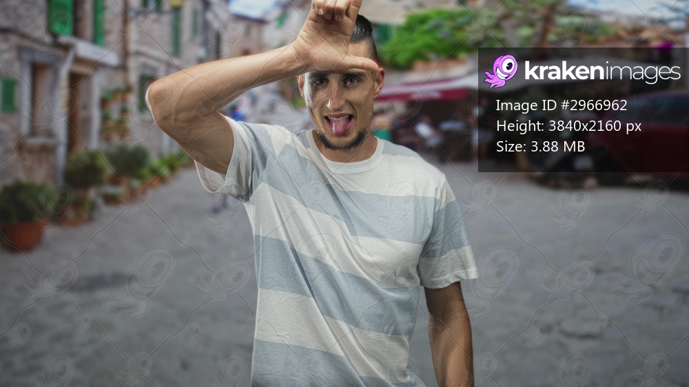 Man sticks out tongue and makes l sign with hand on forehead in a street market with cobblestone paving; playful mischief.