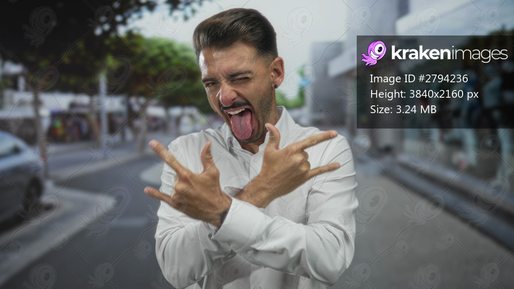 Man sticks out tongue and makes rock horns gesture in city street lined with shops and mannequins; fun.