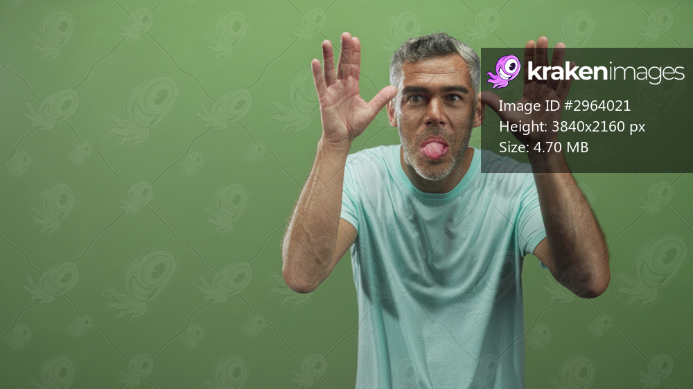 Man sticks out tongue and raises both palms against a green studio backdrop, smiling and clapping in playful poses; playful joy.
