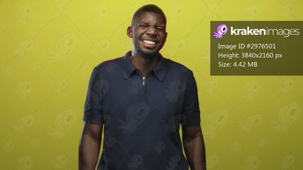 Man sticks tongue out and wears a navy polo shirt in studio with a frontal pose and grin; playful confidence.