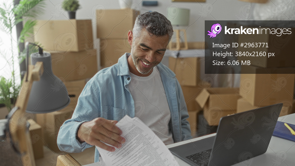 Man stretches hands behind head at laptop among moving boxes in a new home building; relief settling.