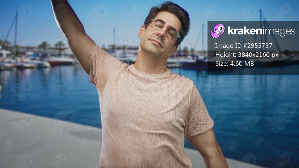 Man stretching arms with eyes closed by a marina dock and boats near a street; relaxation contentment.