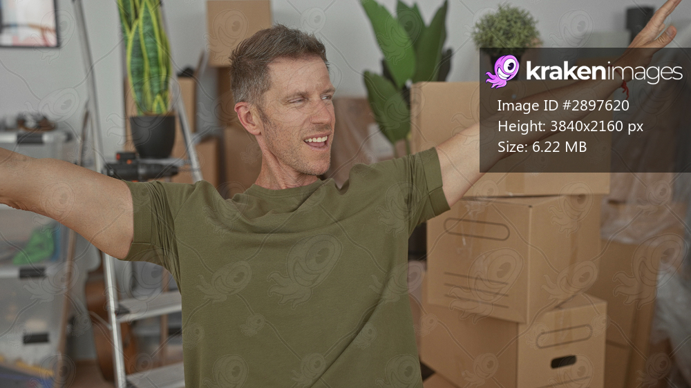 Man stretching arms with hands behind head in building surrounded by stacked moving boxes and ladder for a new home; moving day relief.