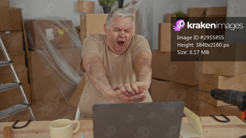 Man stretching hands and yawning at a laptop in a building filled with packed moving boxes and ladder; fatigue patience.