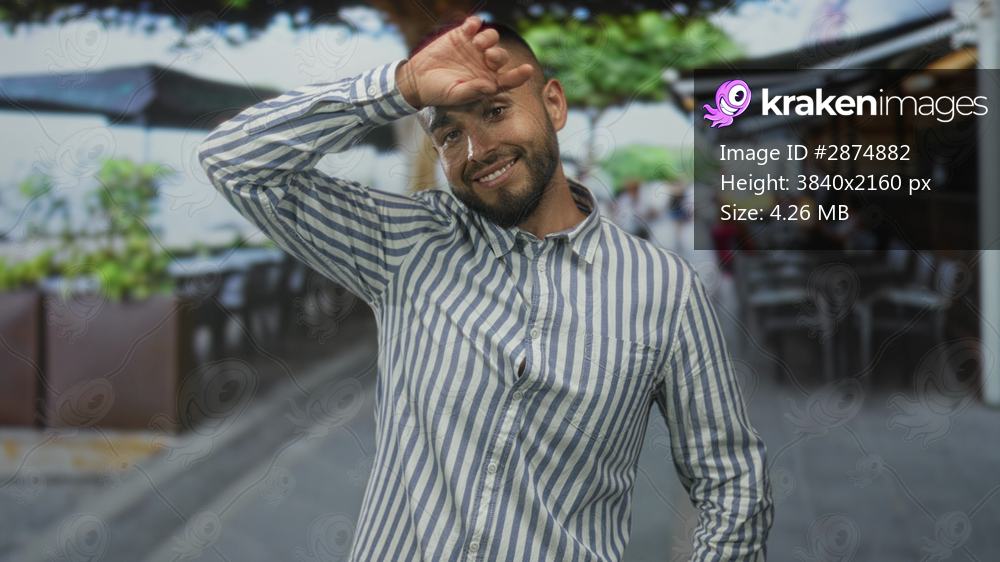 Man with striped shirt and beard smiling while shielding eyes with hand to forehead on a street cafe terrace outdoors; casual confidence.