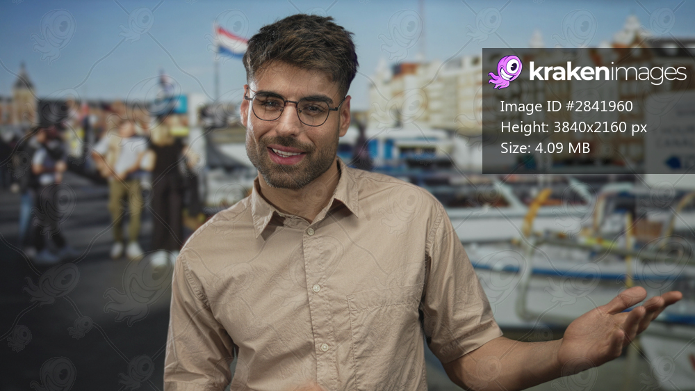 Man strumming air guitar with agile hands on street by vibrant dockside boats and historic buildings; confidence.