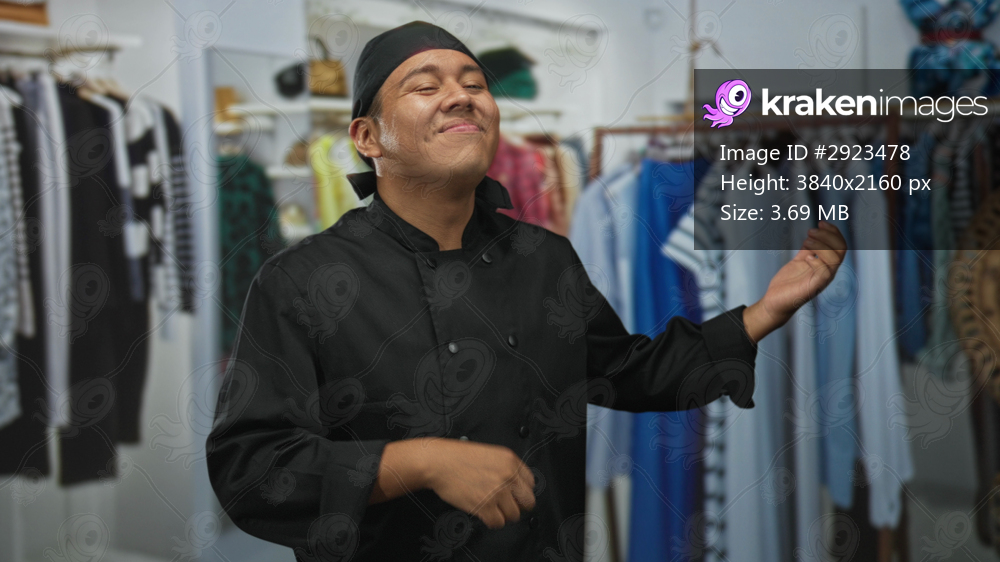 Man strums invisible guitar with hands in clothing shop, eyes closed and smiling; joyful celebration.