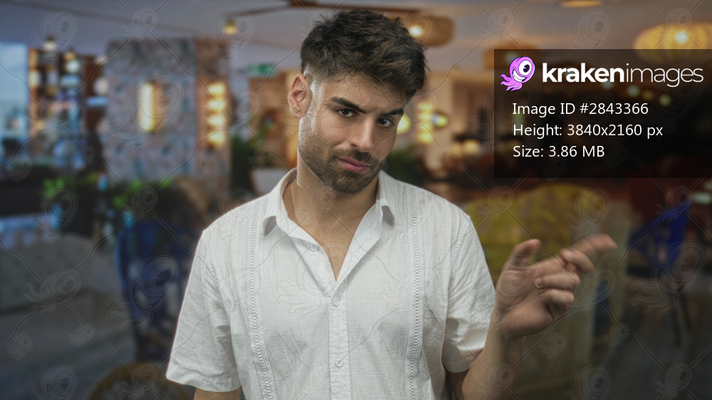 Man with stubble beard points finger while wearing a white linen shirt in a spacious hotel building; doubt.