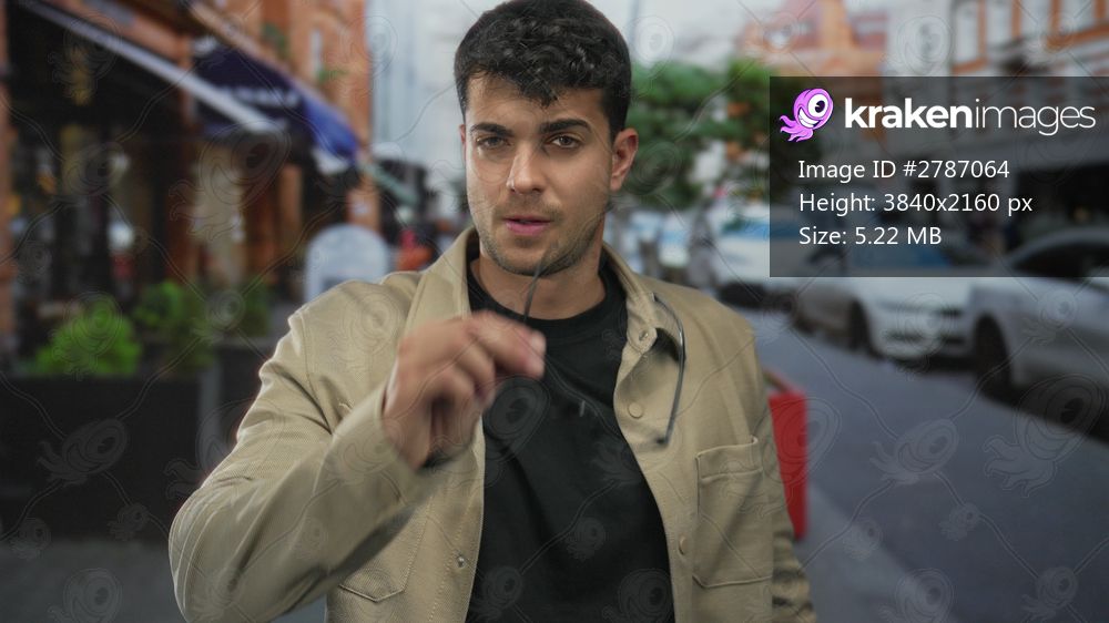 Man with sunglasses removes them while walking down street where male young hispanic poses for an urban casual portrait.