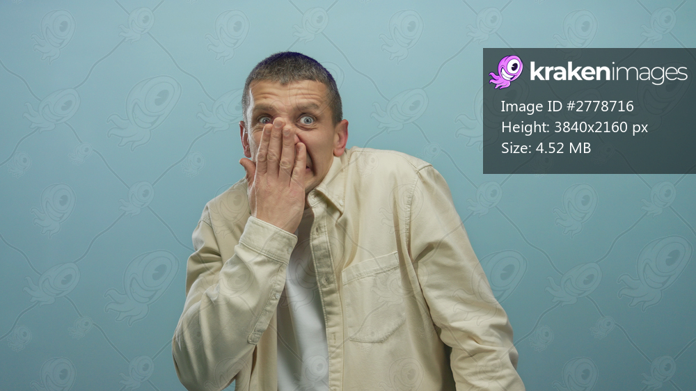 Man with surprised expression covers mouth with hand against blue wall background wearing light shirt depicting shock reaction.