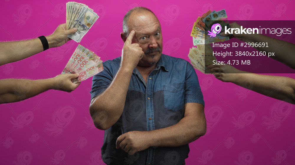 Man surrounded by hands offering cash and banknotes points finger to temple in a studio; skepticism temptation.