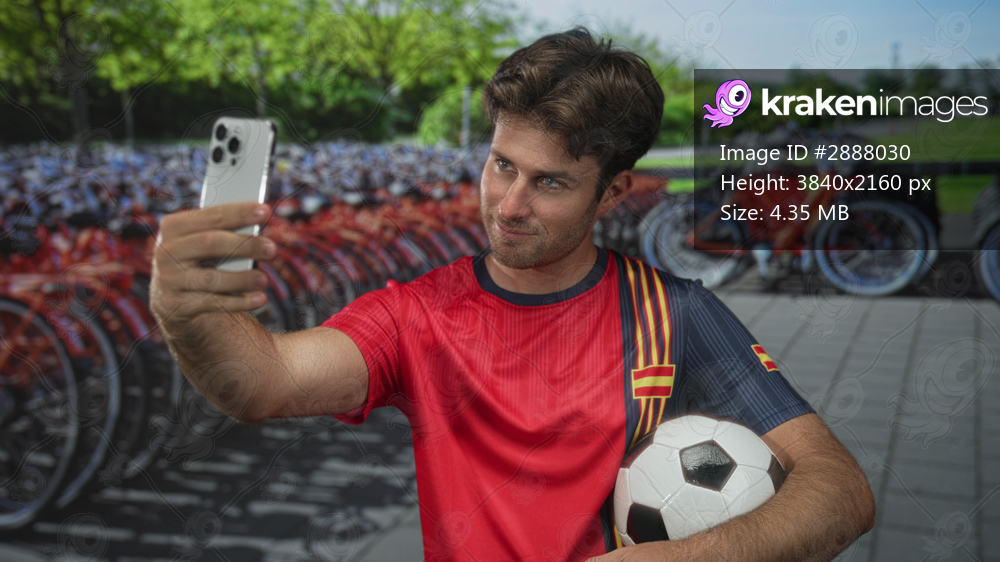 Man taking selfie on street holding soccer ball and smartphone in front of bike rental row; team pride.