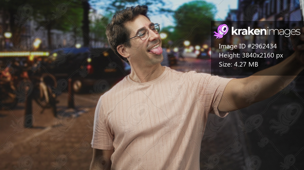 Man taking selfie with smartphone while giving thumbs up on a busy evening city street; playful confidence.