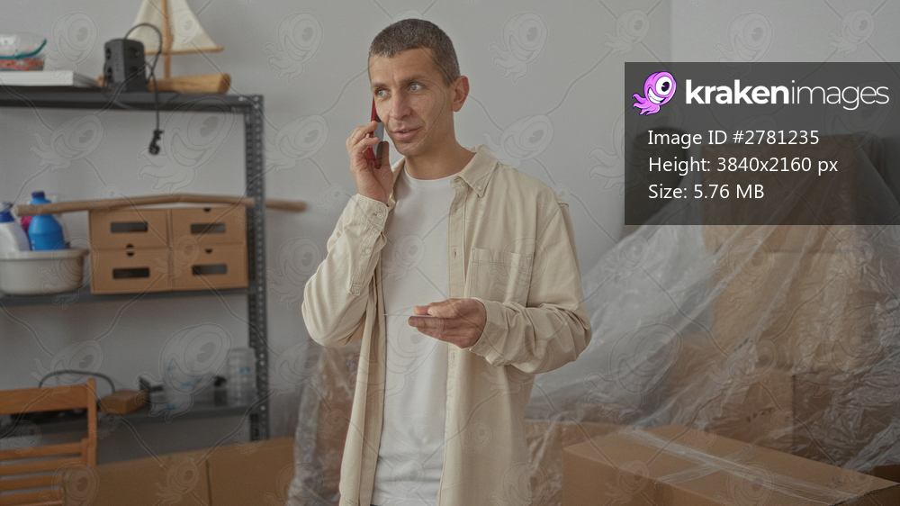 Man talking on phone with credit card in hand surrounded by moving boxes in new apartment living room during unpacking process with shelves and covered furniture in background. - Kraken Images