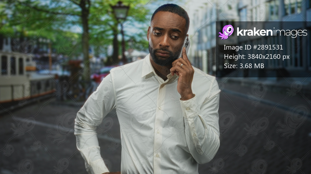 Man talking on phone with hand to ear and other hand on hip, wearing white shirt on street; work call concern.