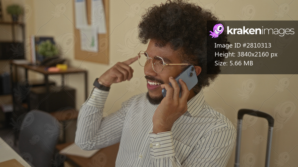 Man talking on phone in a lively office setting with glasses, striped shirt, desk, chair, plant, and bulletin board in the background.