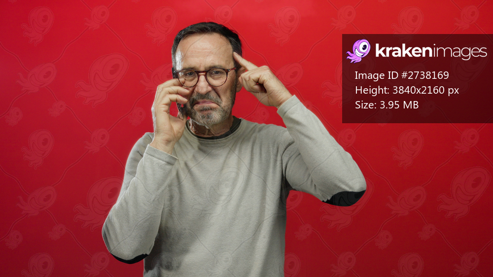 Man talking on smartphone in thoughtful pose against vivid red wall in casual sweater showing middle-aged concentration and communication