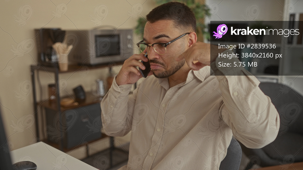 Man talking on smartphone and pointing finger across desk in office workspace with shelves behind him; frustration.