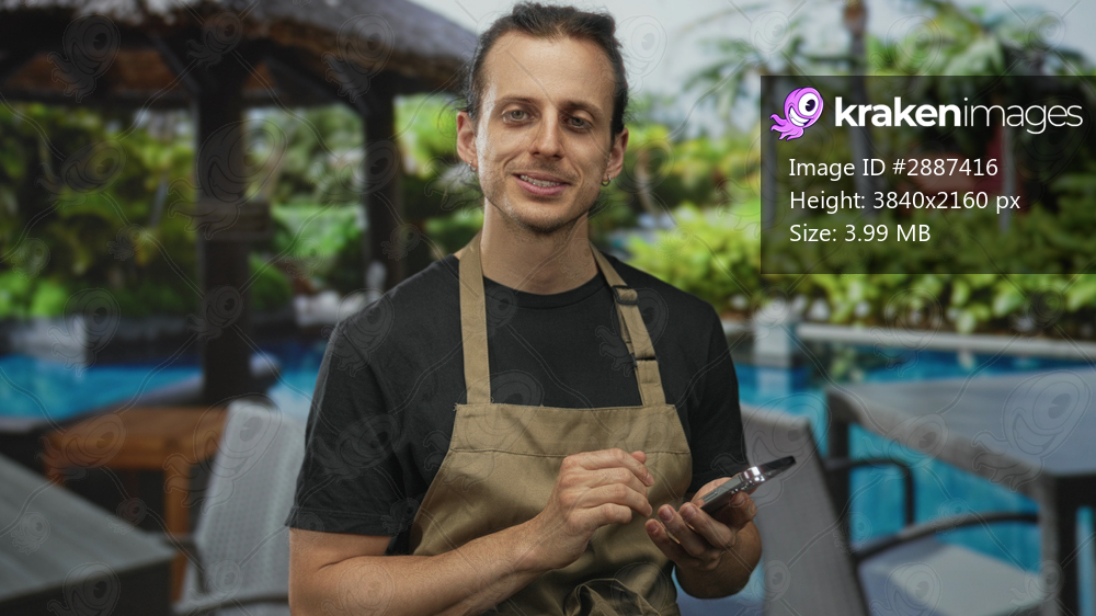 Man tapping phone with hands while wearing apron by pool at resort hotel outdoors near cabana and lounge chairs; calm concentration.