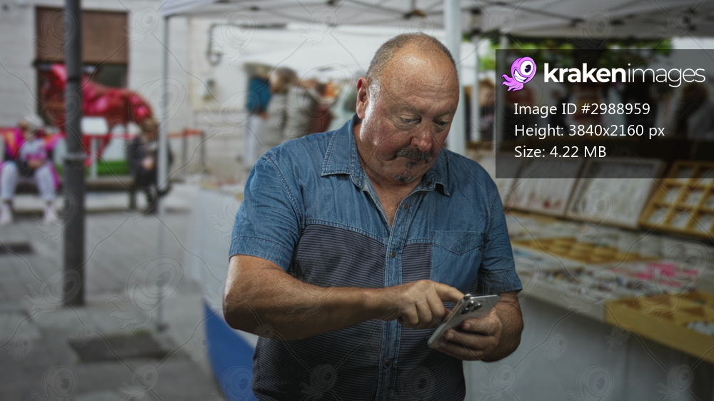 Man tapping smartphone with finger at street market stall near jewelry display under white canopy, wearing blue denim shirt and focused on screen; concentration curiosity. - Kraken Images