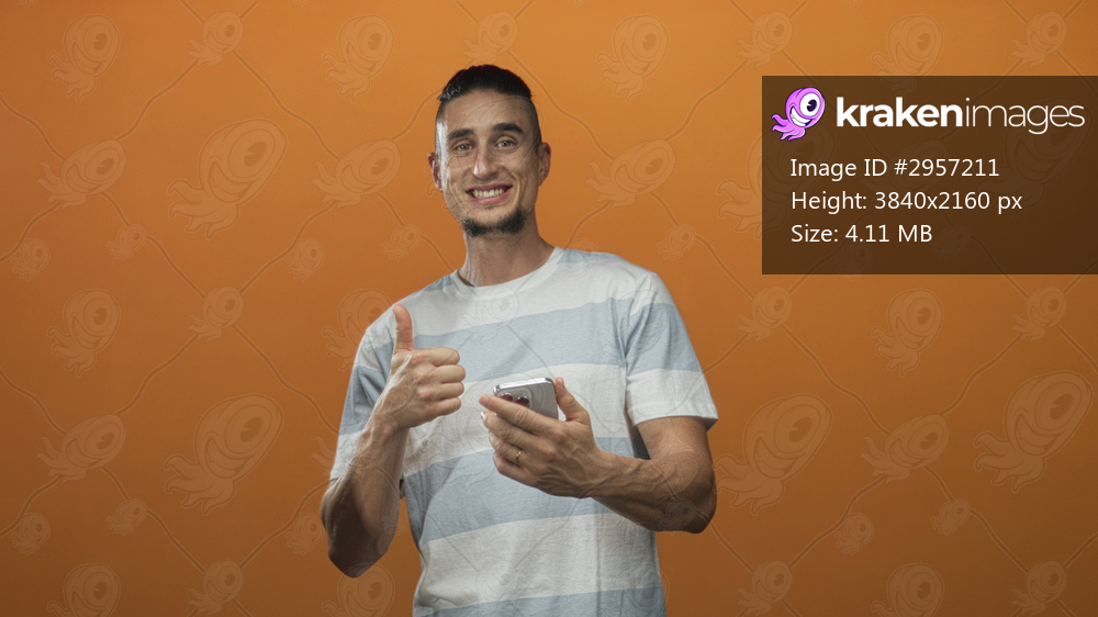 Man tapping smartphone and giving thumbs up gesture in studio orange backdrop, looking at phone; joy connection engagement.
