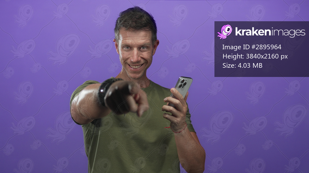 Man tapping smartphone and pointing finger at camera in purple studio;confidence connection engagement.