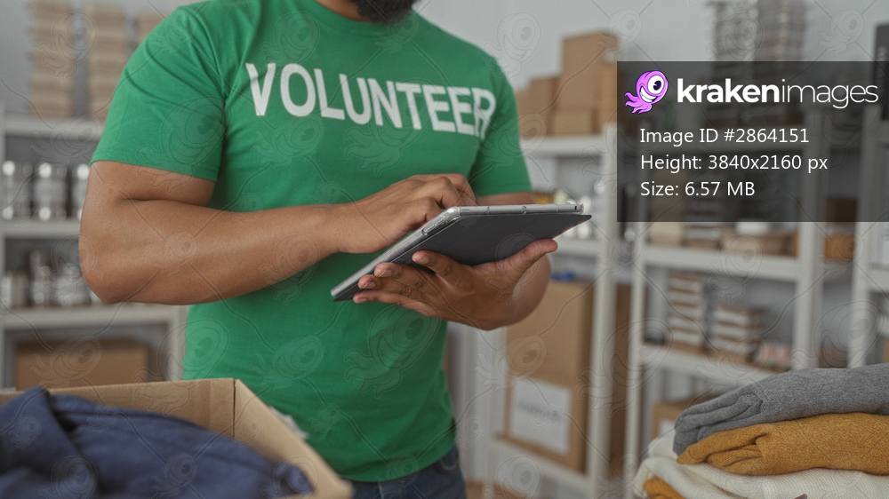 Man tapping tablet with both hands wearing volunteer shirt amid stacked boxes and folded clothes in donation building; community service compassion.