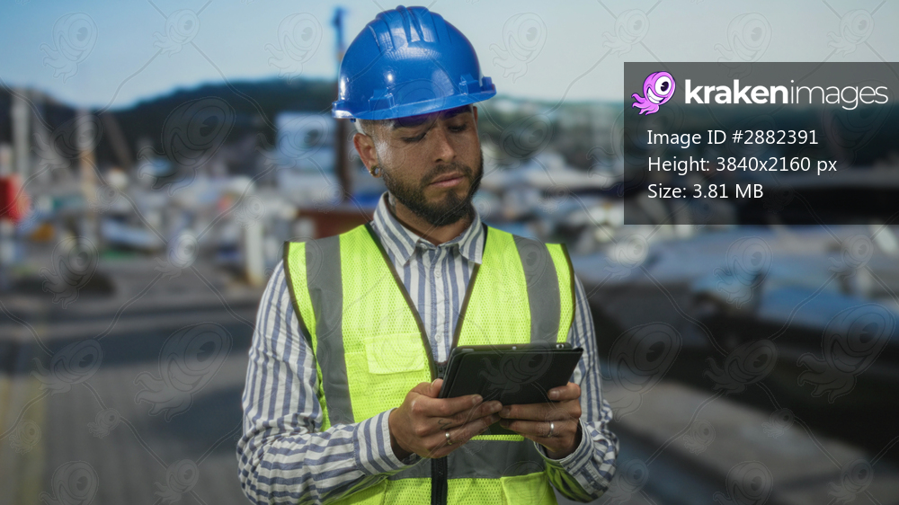 Man tapping tablet with hands, blue hardhat and safety vest at building port dock; focused productivity safety.