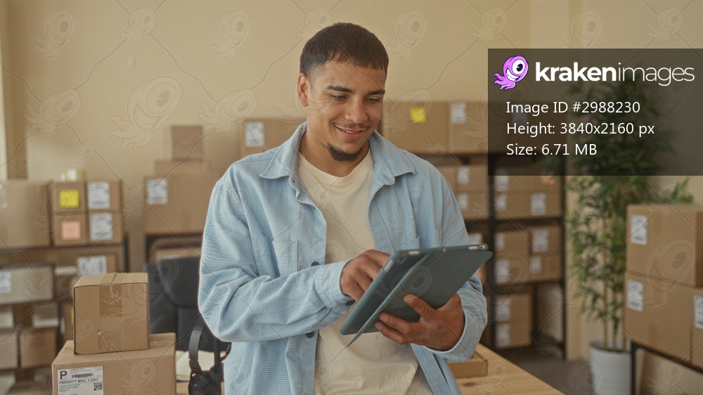 Man tapping tablet with hands while checking cardboard boxes in a building packing area; small business confidence.