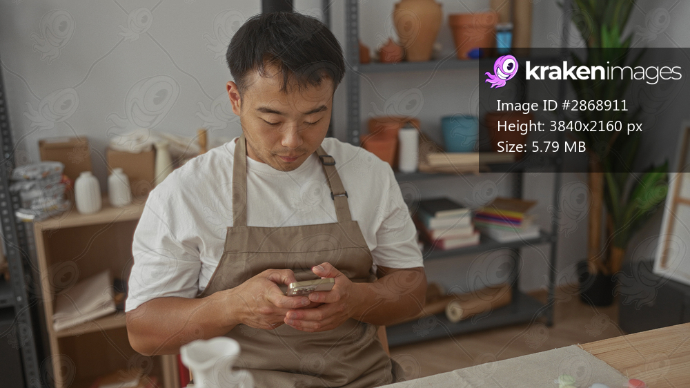 Man taps smartphone screen while seated at ceramic worktable scattered with clay modeling tools in studio; serenity.