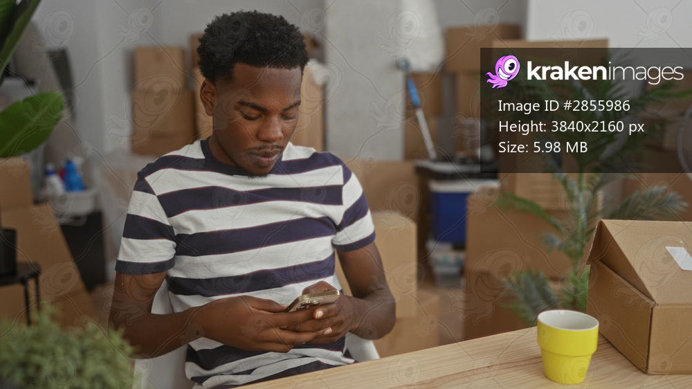 Man taps smartphone while seated at wooden table in new home living room with cardboard boxes; contentment.