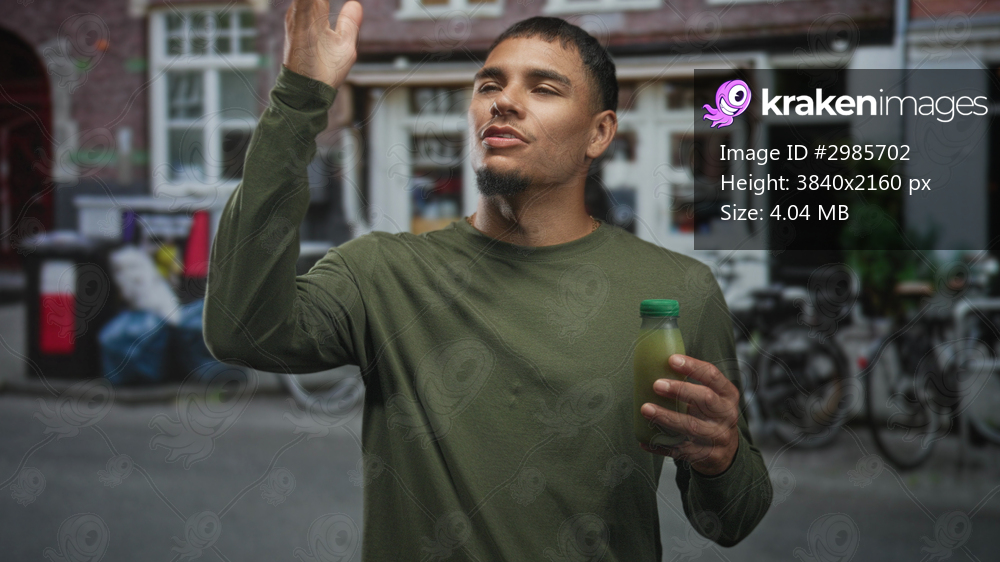Man tasting green juice bottle, hand to lips while holding bottle on a city street with storefront and bicycles; quiet satisfaction.