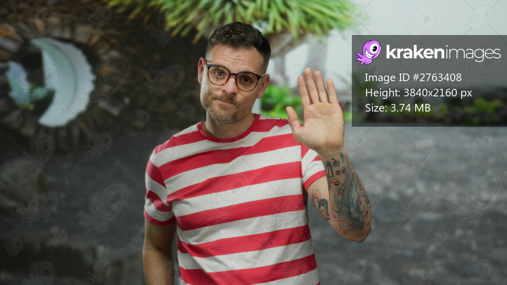 Man with tattoos in red striped shirt standing outdoors with plants and stone wall in background, looking curious.
