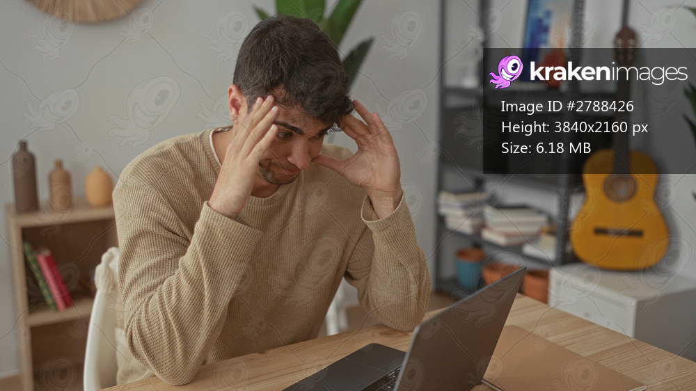 Man, temples aching, rubs them as he stares at laptop while hispanic young male sits home feeling frustrated and stressed.